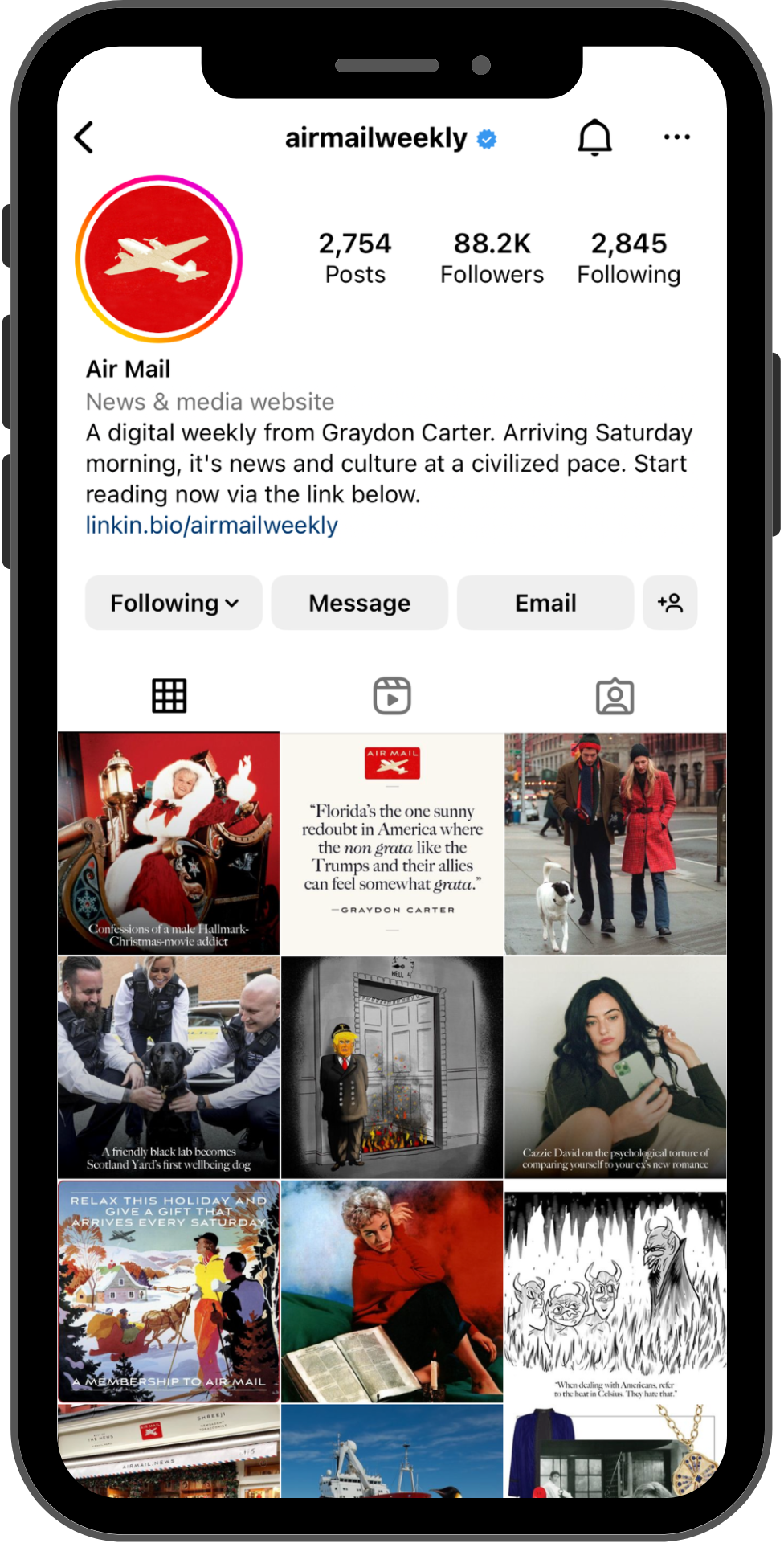 Air Mail is digital weekly magazine created by long-time Vanity Fair editor Graydon Carter. As the publication’s first Social Media Manager, I built the multi-channel social strategy and dynamic content calendar from the ground up, driving brand awareness among target demographics. I lead daily community engagement efforts with a strong editorial instinct and drove a 111% increase in Instagram followers between January 2020 and January 2021. I wrote engaging copy for organic and paid creative campaigns, tailored expertly by platform, audience and format. I collaborated with cross-functional teams to execute influencer marketing and branded social activations with clients including Warby Parker, Michael Kors, and Frieze Art Fair.